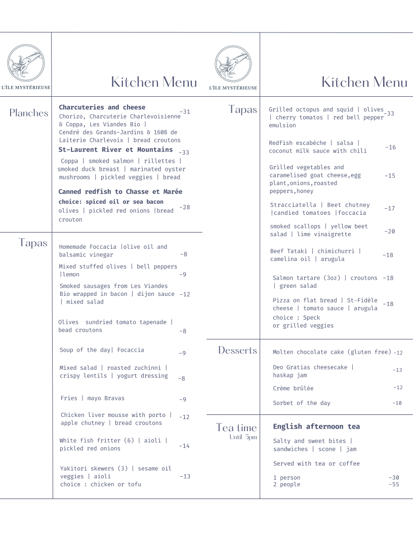 Welcome to L'ile Mysterieuse, a culinary treasure nestled in La Malbaie, Quebec. This enchanting restaurant offers a menu brimming with vibrant flavors and artisanal delights that captivate your senses. Noteworthy are their Planches, featuring exquisite selections like Charcuteries et Fromages and mouthwatering Fleuve et Montagnes Coppa, perfect for sharing and indulging.